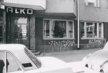 | JUOPUKAA ELÄMÄSTÄ -teksti ALKOn myymälän ovensuussa talon ulkoseinässä Maurinkatu 8:ssa. | |